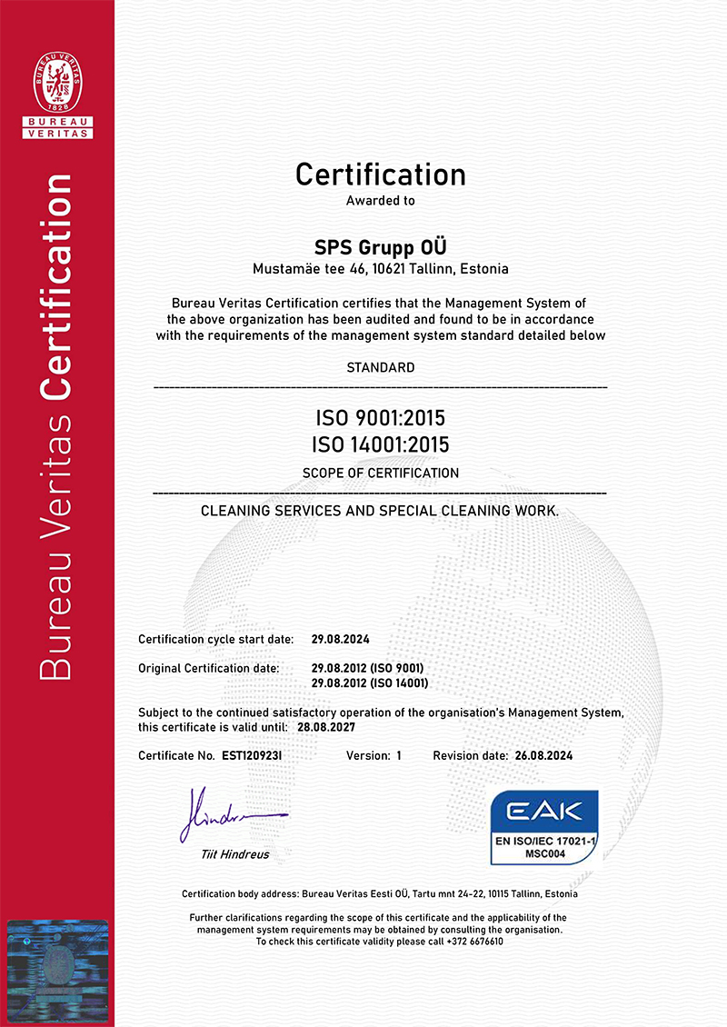SPS Group is one of the few Estonian companies in the cleaning sector that operates according to the international quality and environmental standards ISO 9001:2015 and ISO 14001:2015.